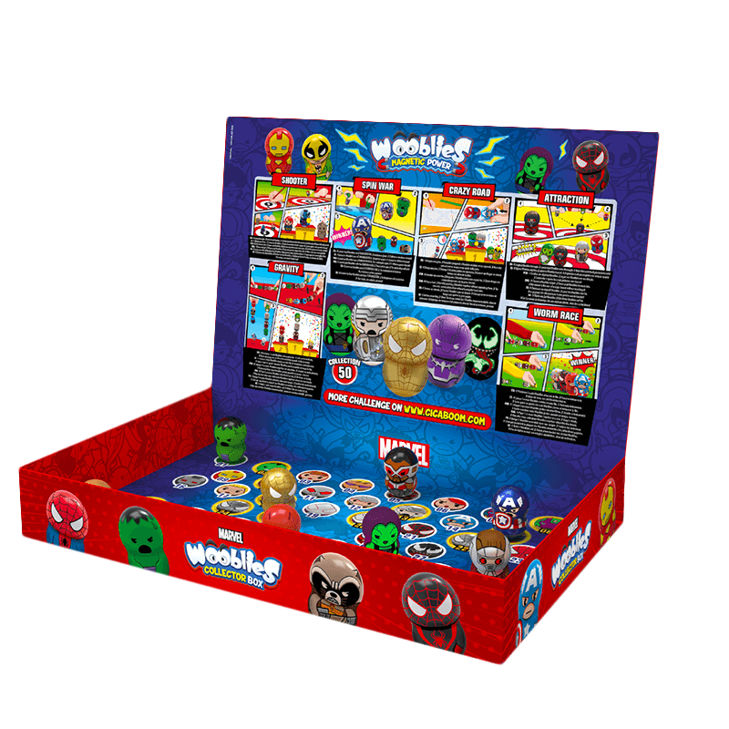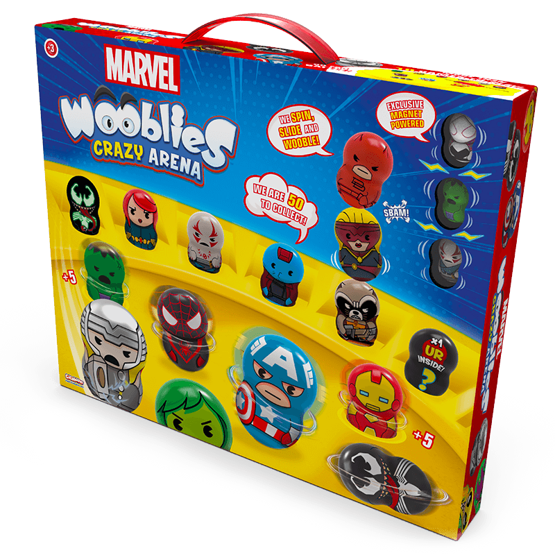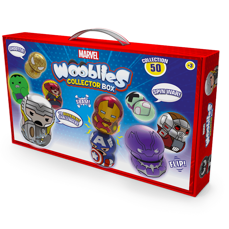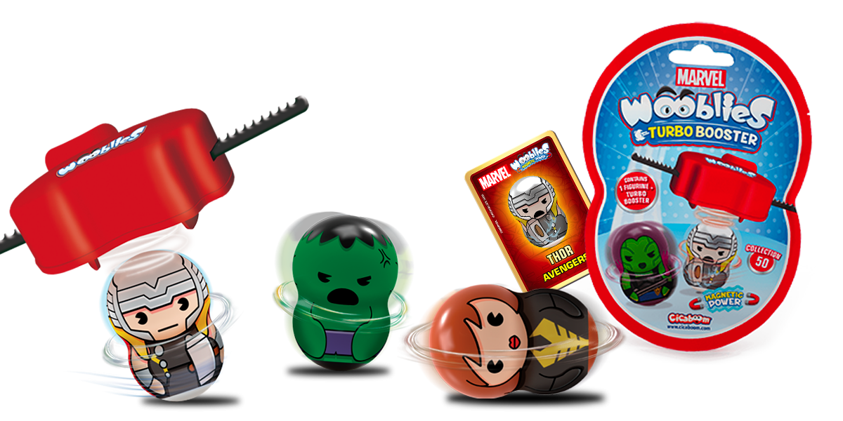 Launch your superheroes Marvel Wooblies with the TURBO BOOSTER and make them spin super fast! Last one to stop wins!