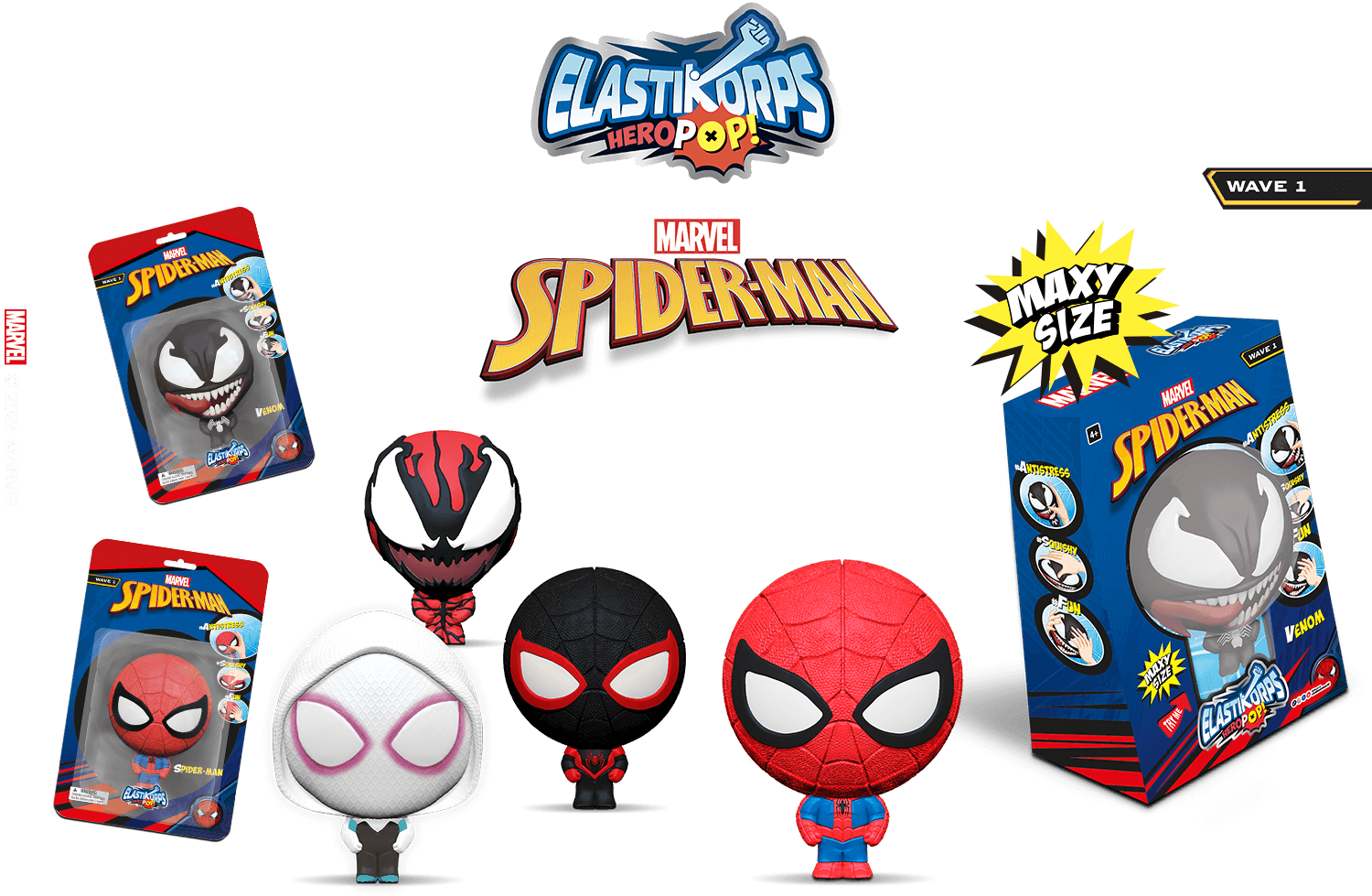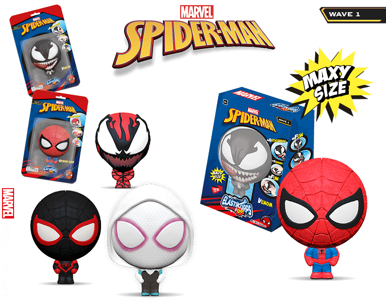 La nuova collezione Elastikorps Heropop Spider-Man con 6 action figure elastiche e 3 MAXY Size!