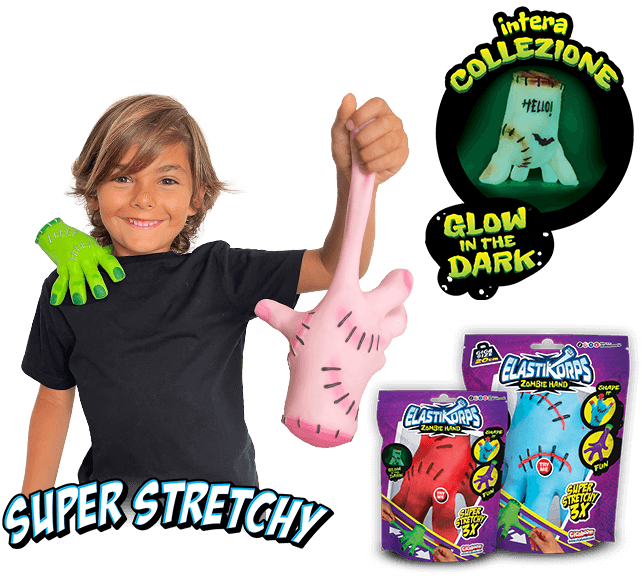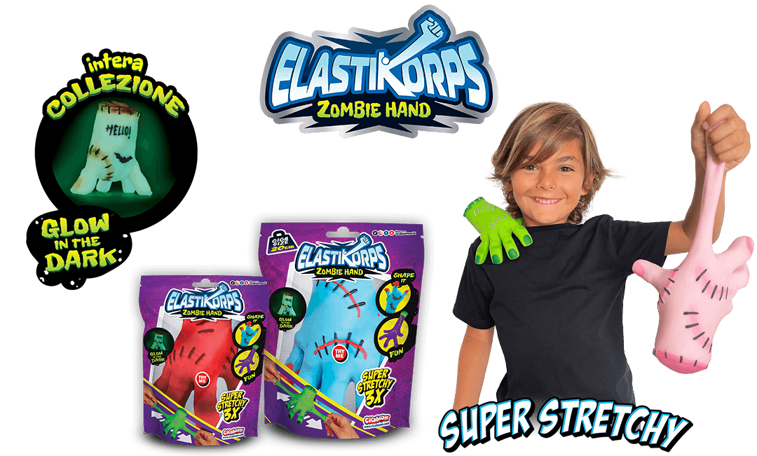 La nuova collezione Elastikorps Zombie Hand con 6 mani elastiche e 4 GIGA Size. Tutte Glow in the dark e Super stretchy