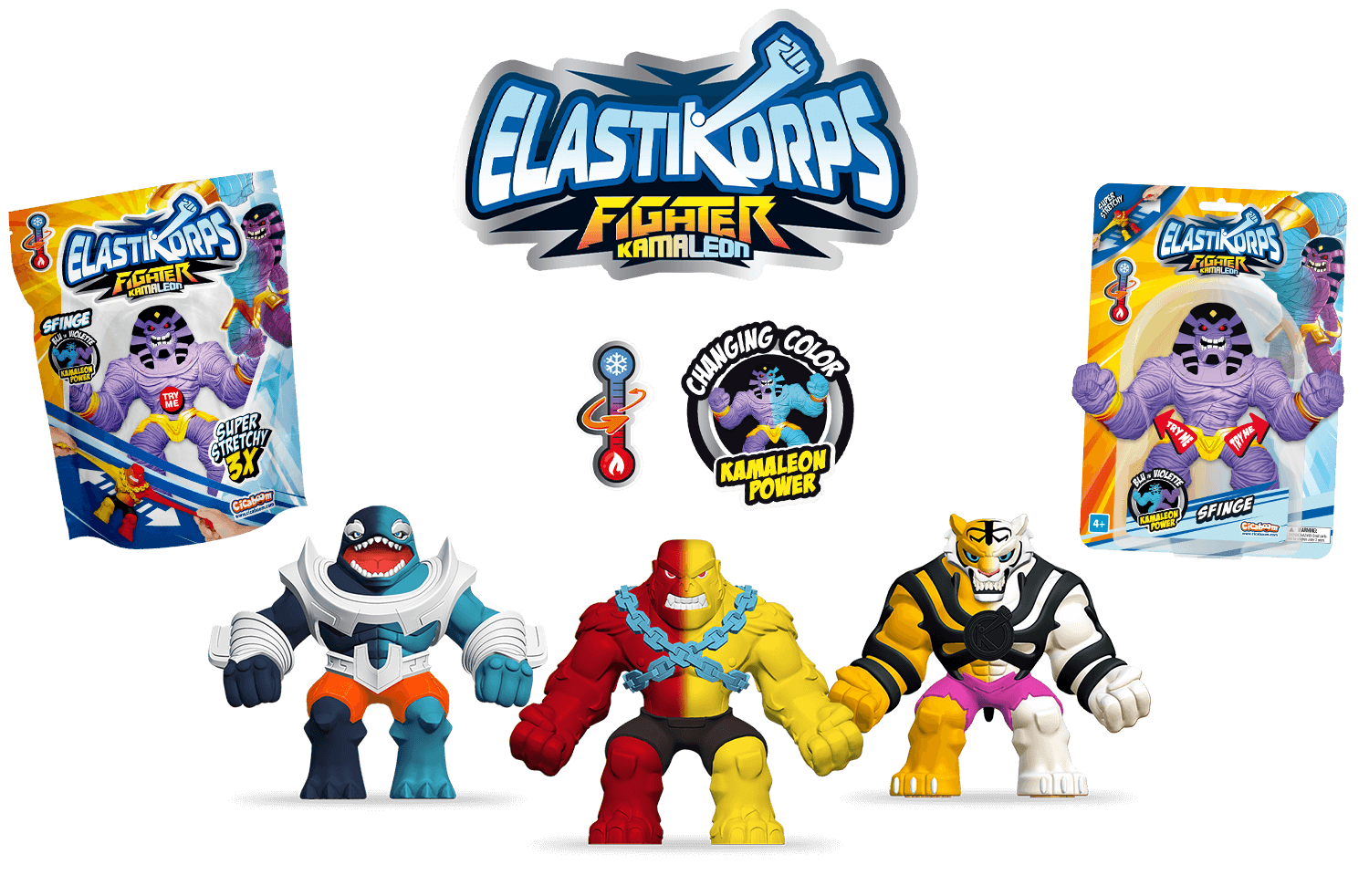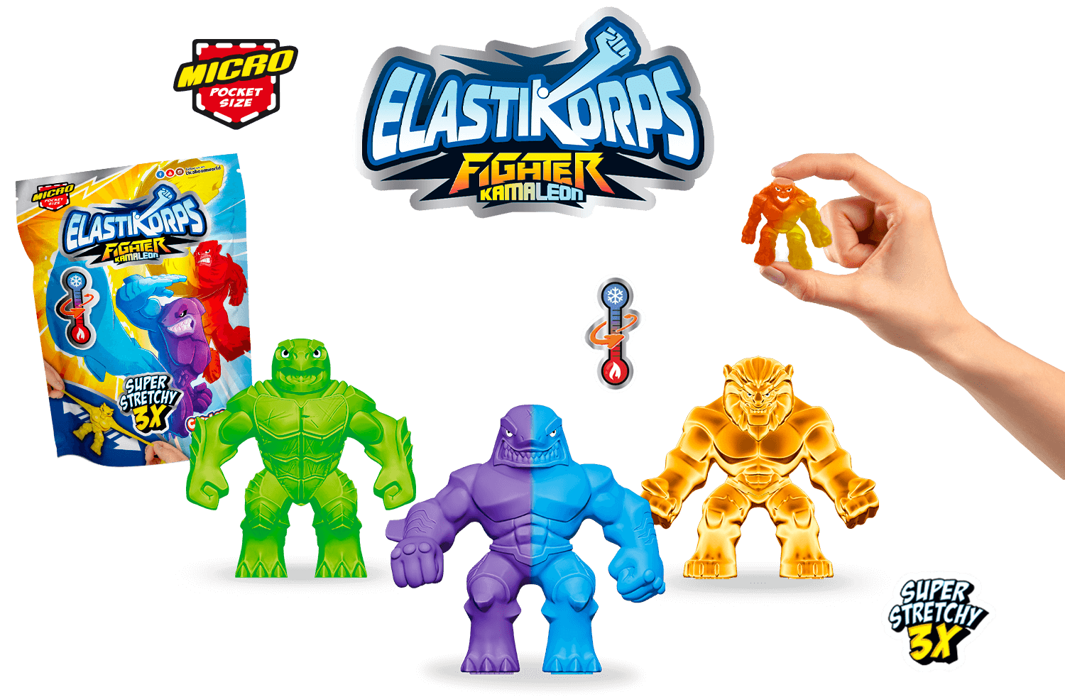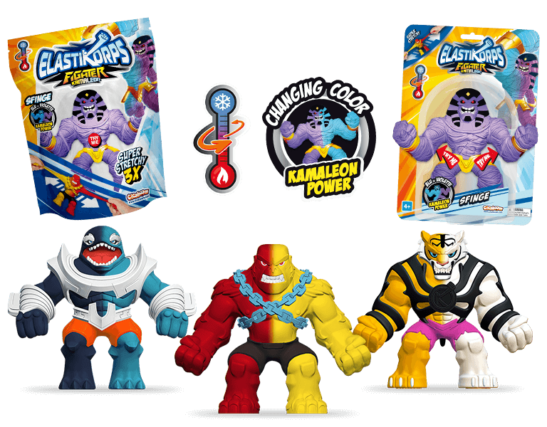Scopri gli Elastikorps™ Fighter Kamaleon Hero Size: 8 combattenti elastici che cambiano colore!